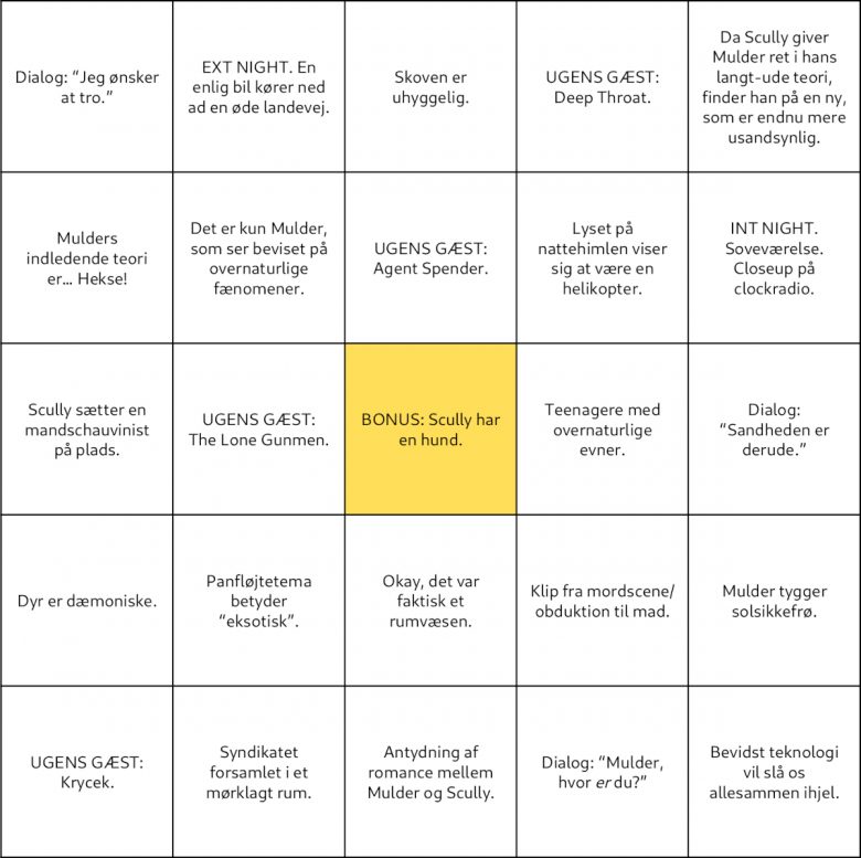 Her er en lille bonus til dig, der er i gang med at gense X-files (vi ved, du er derude, ligesom sandheden). I stedet for en spydig gennemgang af seriens klichéer og temaer, har vi samlet dem i fire bingoplader, som du kan printe ud og terrorisere din familie med.
